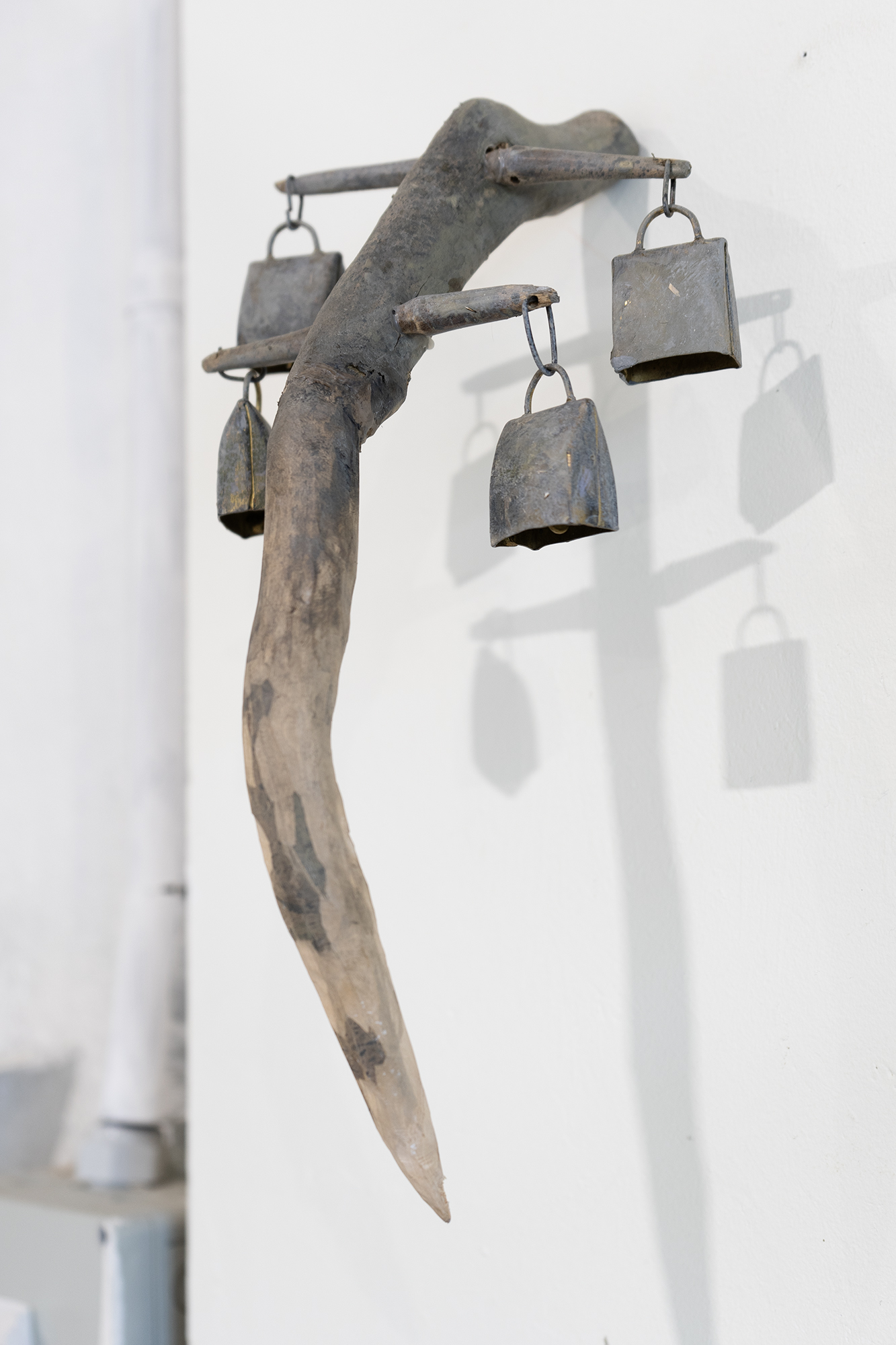 The form still alludes to the objects’ original functions but are given new meaning and form by being taken apart and put together again. The old cow bells are in their current state, silent, unused, and suspended in stillness. But still evoking the idea of movement and sound, hinting at something that was once called out. Through their physical form they hint at a more violent untold history , lost narratives still present in its material remnants.